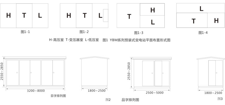 YBM系列預裝式變電站,根據排列方式分“目”字形排列(圖1-1、圖1-2);“品”字形排列(圖1-3、圖1-4)。外形尺寸見圖2、圖3。