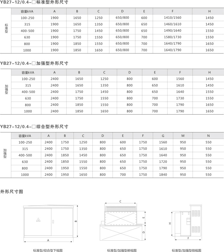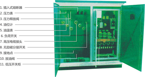 該產品將高壓負荷開關、高壓熔斷器置于變壓器油中,具有與變壓器器身共箱或分箱兩種結構形式。油箱采用全密封結構,配有油溫表、油位表、壓力表、壓力釋放閥、放油閥等元件以監測變壓器運行狀況。該產品分為環網型、終端型及電源型供電方式。為了使此種產品更適合于我國電網的實際要求,公司又推了插拔型干式熔斷器,熔絲的熔斷不影響變壓器油的性能。根據低壓饋出要求的復雜程度,YBM-12/0.4型產品分為標準型、加強型和綜合型三種外殼形式,使用戶和設計單位在選型時,做到更靈活、更經濟。