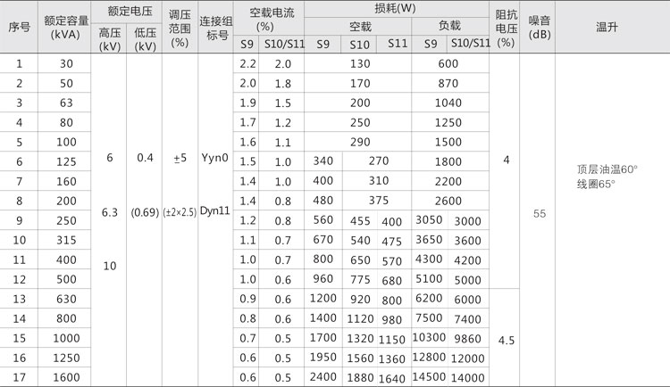 10KV預裝式變壓站用S9、S10、S11系列油浸式變壓器性能水平
