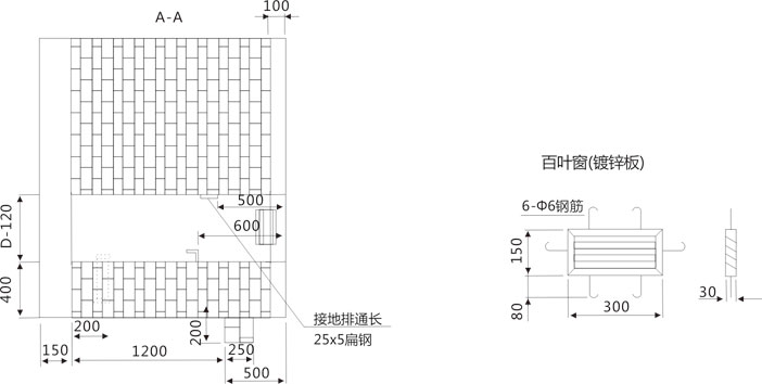 ◎ 百葉窗里惻加焊150x300的鋼板網(10x20)菱形眼,百葉窗外框焊筋爪埋入墻內。
